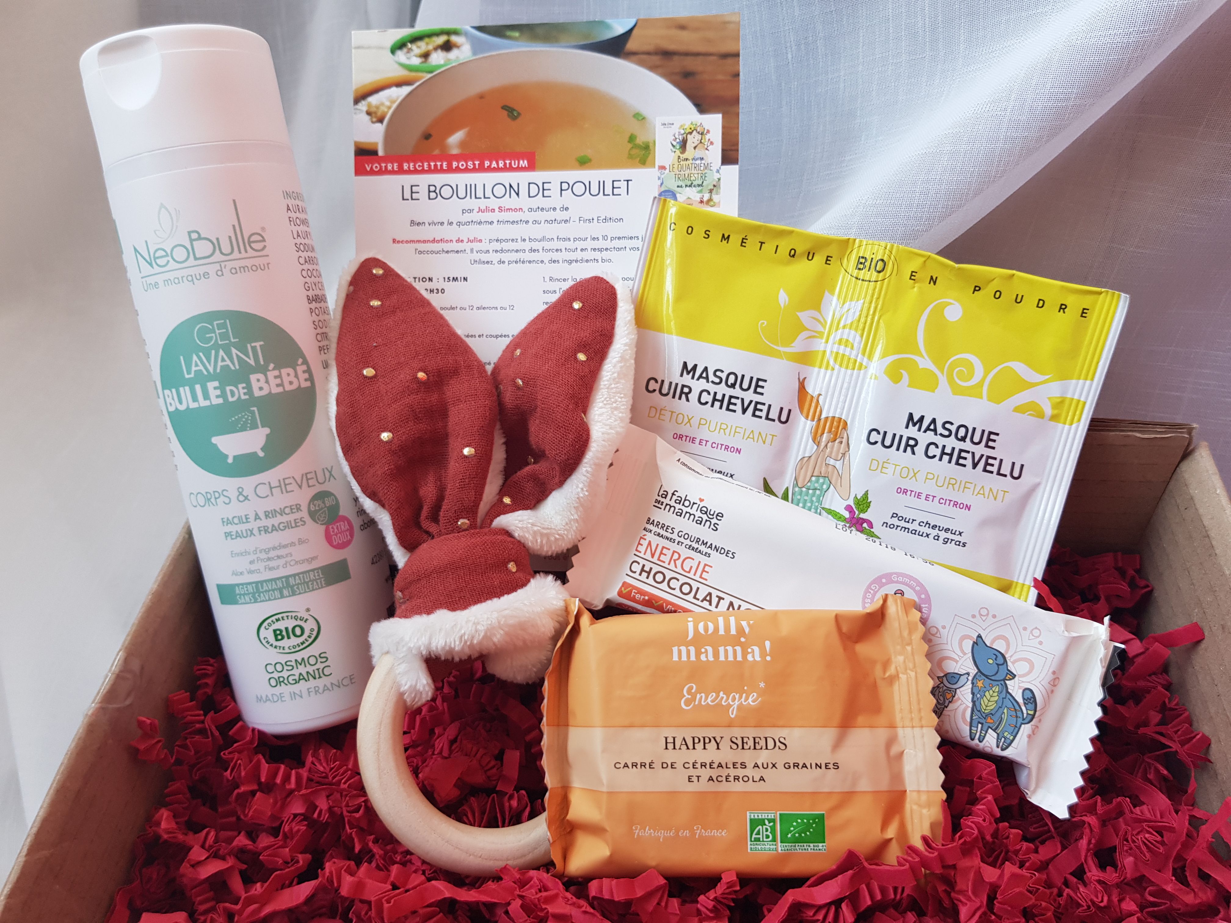 C’est simple ! Sélectionnez la gamme "La Jolie" 1 mois, à 29,90€. Lorsque vous aurez passé commande, vous recevrez une carte cadeau par mail. Vous pouvez soit l’envoyer à la jeune maman qui l’activera elle-même ou bien l’activer vous-même en remplissant les coordonnées des parents. Dans cette box, on y trouve 5 produits bio et de fabrication française de grande qualité. Pour bébé, Bulle de maman y glisse un soin grand format ainsi qu’une création artisanale et pour maman : 2 gourmandises, 2 soins type masque ou gommage et une carte recette spéciale post partum.