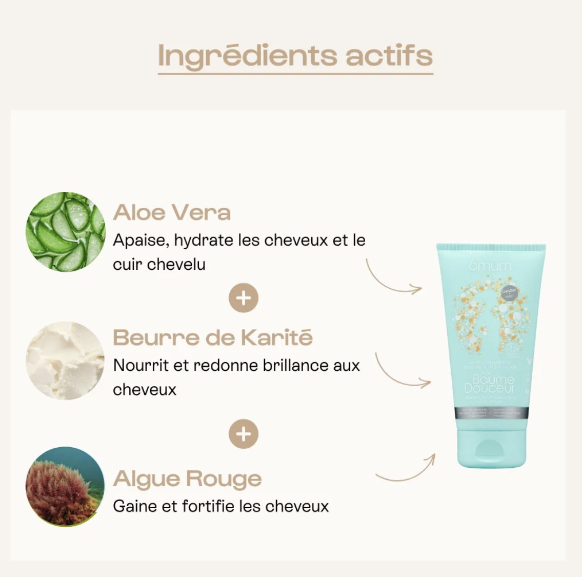 Pour la brillance et la vitalité, c'est l'aloé vera et le beurre de karité qui ont des vertus hydratantes et nourrissante. Pour renforcer les cheveux, ce sont les extraits d'algues rouges qui agissent.