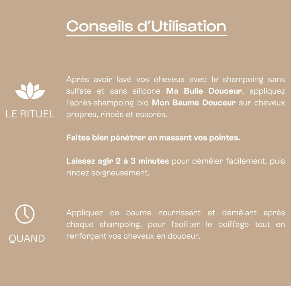 Appliquez l'après-shampoing bio Mon Baume Douceur après avoir lavé vos cheveux avec un shampooing, sur cheveux rincés et essorés. Privilégiez les longueurs et non les racines.