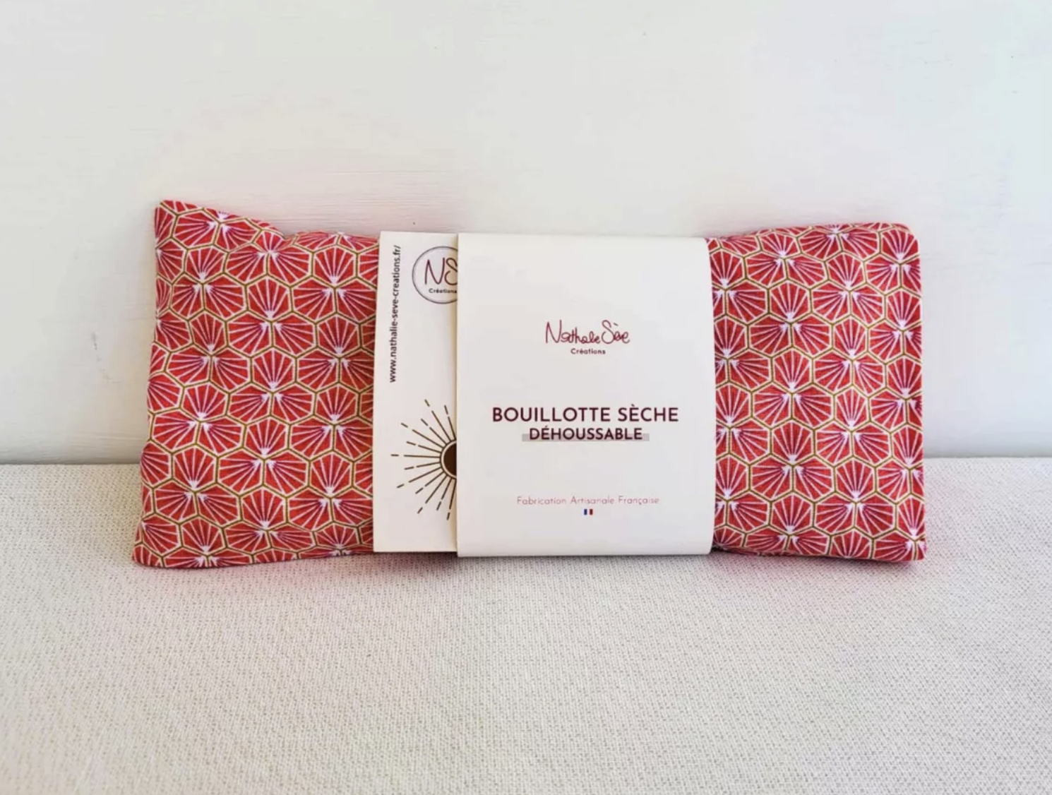 La bouillotte est rĂ©alisĂ©e en bachette de coton remplie de grains de blĂ©, et habillĂ©e d’une housse de qualitĂ© en coton.