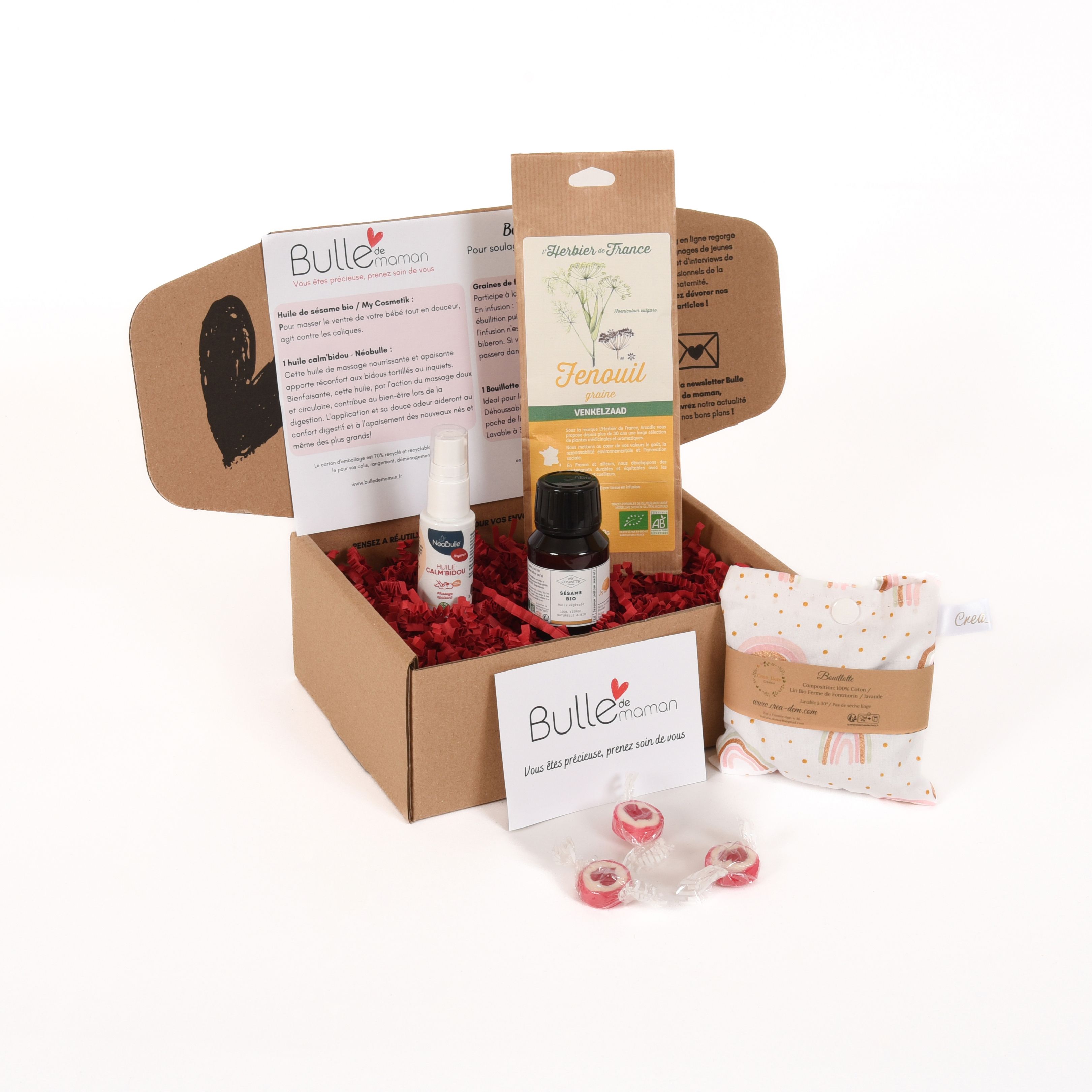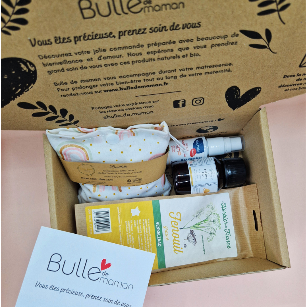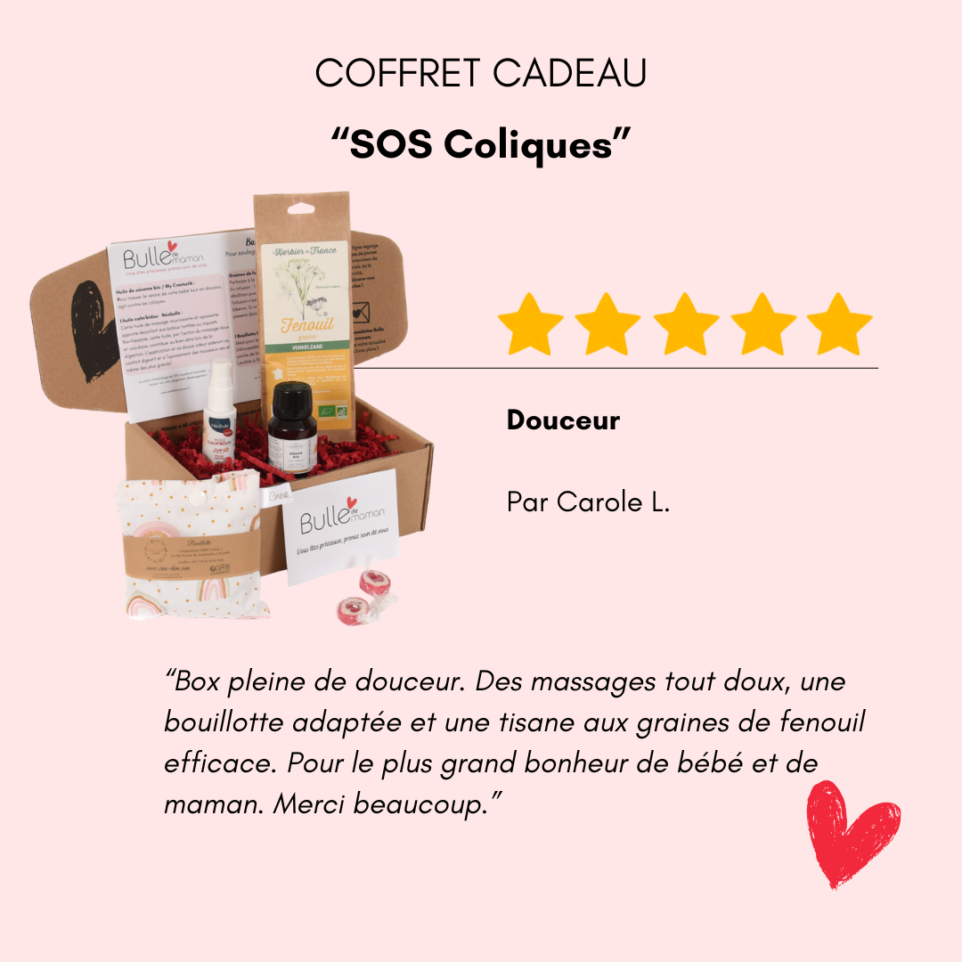 Box pleine de douceur. Des massages tout doux, une bouillotte adaptée et une tisane aux graines de fenouil efficace. Pour le plus grand bonheur de bébé et de maman. Merci beaucoup.
