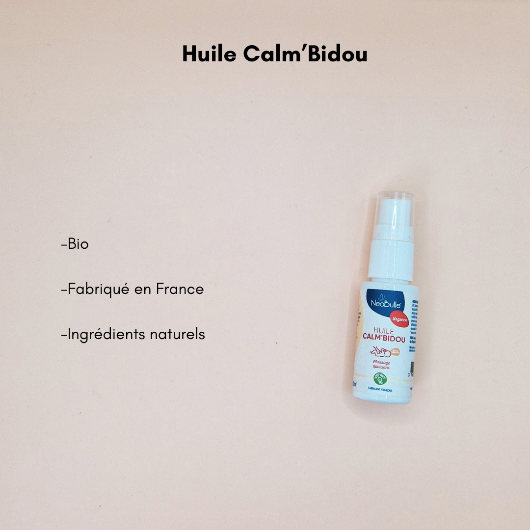 Huile calm'bidou - NĂ©obulle - 20ml : Cette huile de massage nourrissante et apaisante apporte rĂ©confort aux bidous tortillĂ©s ou inquiets. Bienfaisante, cette huile, par l'action du massage doux et circulaire, contribue au bien-ĂȘtre lors de la digestion. L'application et sa douce odeur aideront au confort digestif et Ă  l'apaisement des nouveaux nĂ©s et mĂȘme des plus grands!