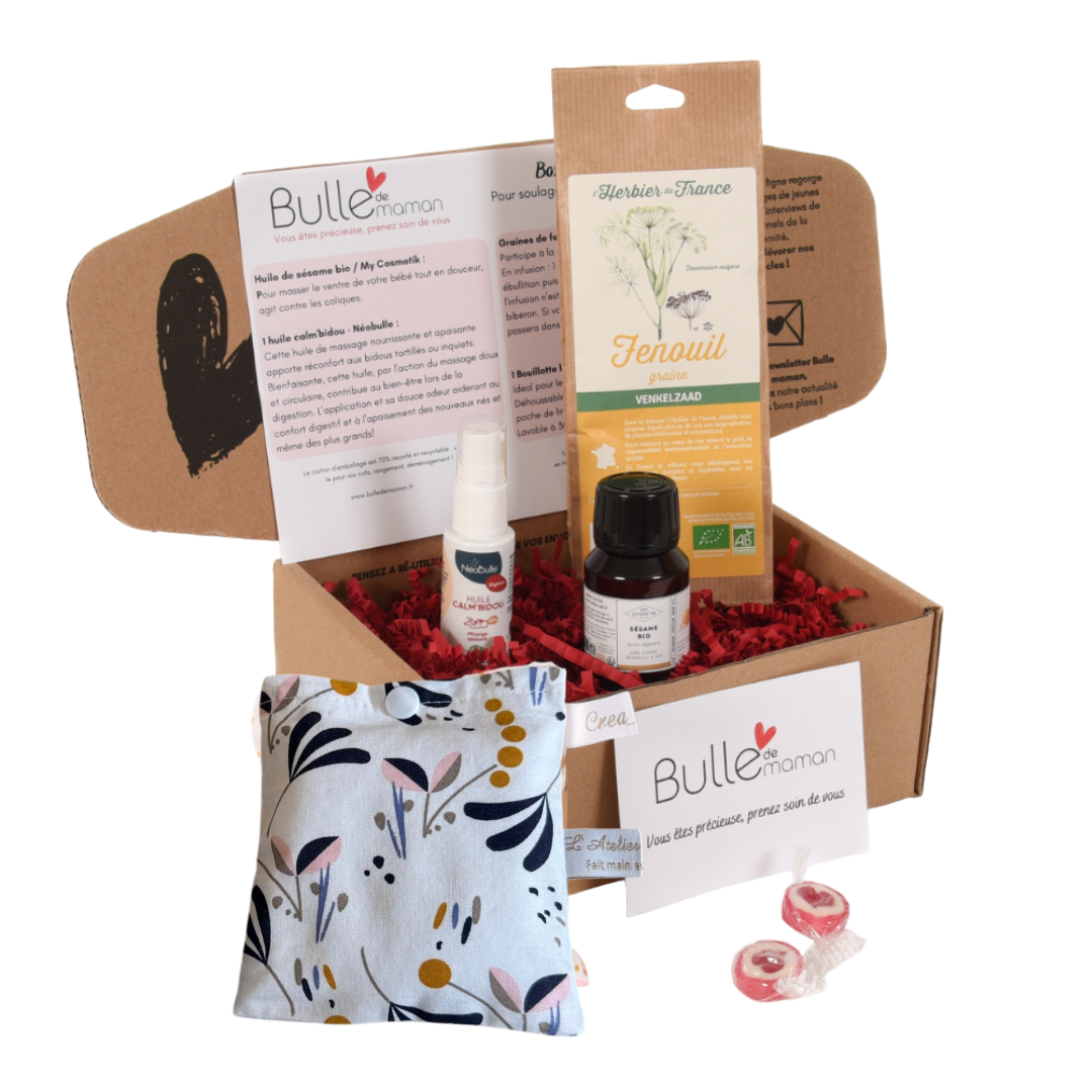 Box pleine de douceur. Des massages tout doux, une bouillotte adaptée et une tisane aux graines de fenouil efficace. Pour le plus grand bonheur de bébé et de maman. Merci beaucoup.