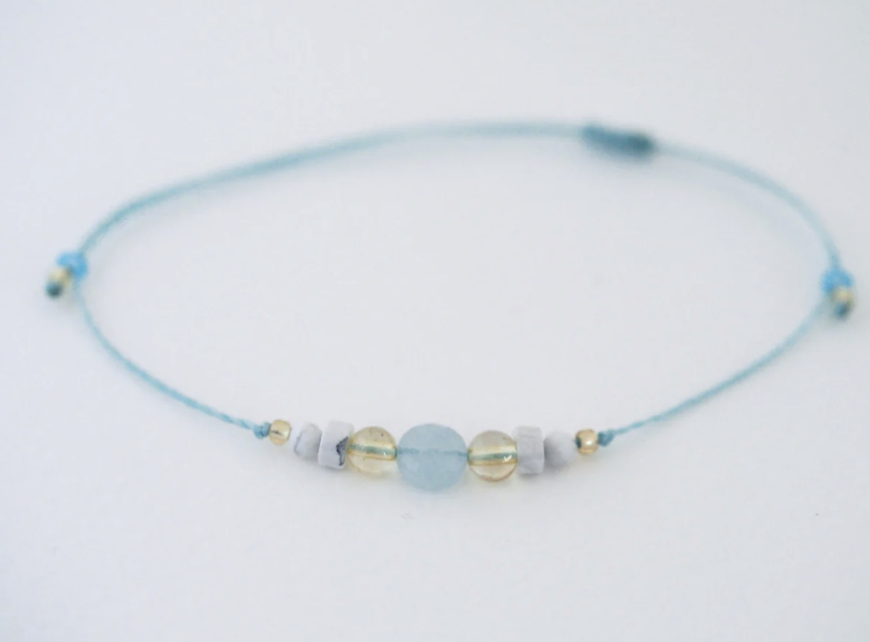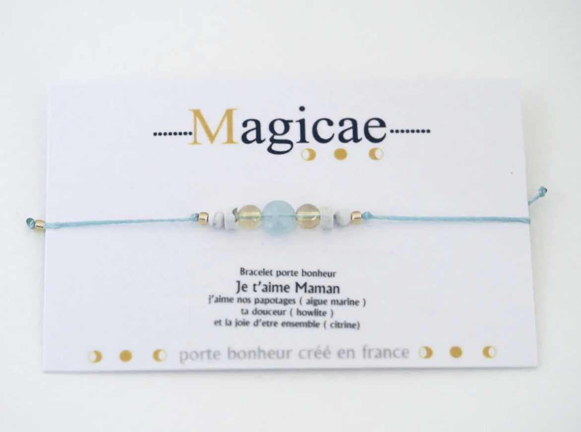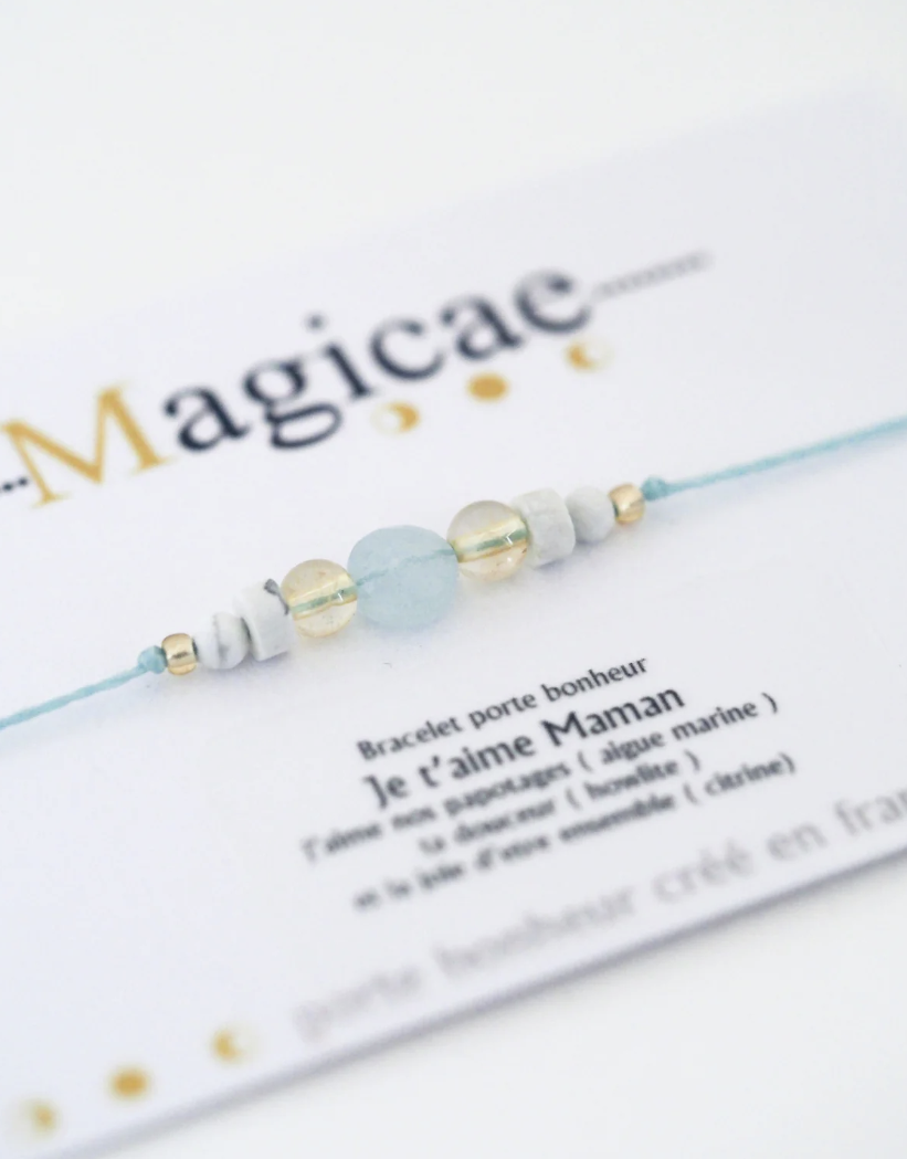 Je t'aime maman : j'aime nos papotages (aigue marine) , ta douceur (howlite) et ta joie d'être ensemble (citrine)