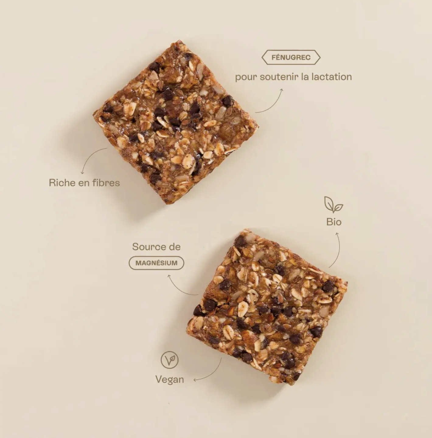 Flocons dâavoine : contribuent Ă la satiĂ©tĂ© et Ă limiter les fringales Amandes : riches en calcium Bananes : potassium, vitamine B6 et antioxydants (entre autres !) Levure de biĂšre : vitamines B pour combattre la fatigue et lutter contre le baby blues Graines de lin brunes : omĂ©ga-3 Graines de tournesol : vitamines B et E, Fer Chocolat : magnĂ©sium Huile de micro-algue : naturellement riche en omĂ©ga 3 Agave : pour sucrer juste ce quâil faut en gardant un faible index glycĂ©mique