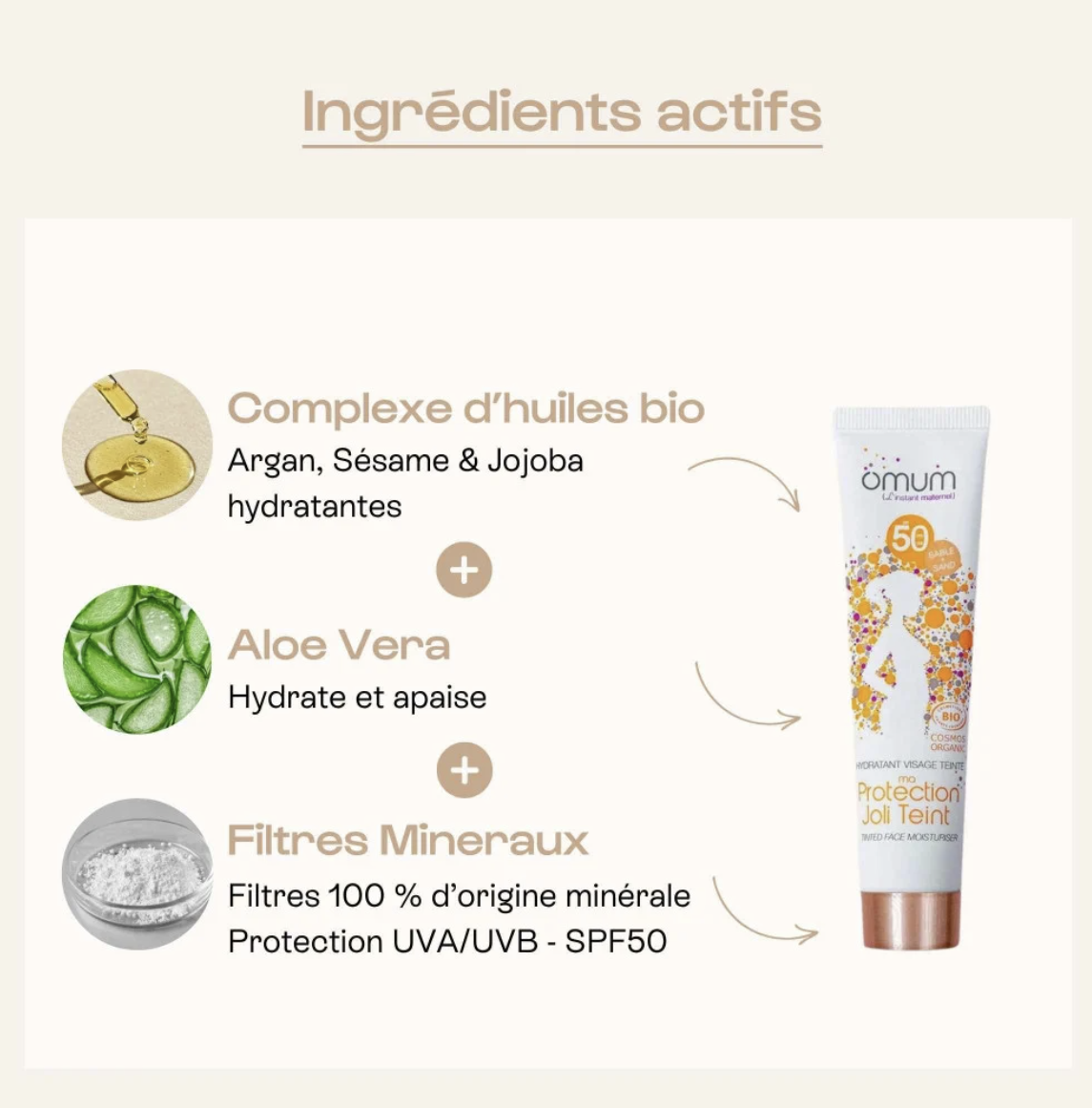 Concernant la crème solaire MA PROTECTION JOLI TEINT, nous sommes sur une crème galénique pour laquelle Omum a prouvé qu'il n'y a pas de risques d'inhalation et que celle-ci ne pénètre pas dans l'organisme. Une étude a été réalisée sur 7 produits solaires de marques certifiées BIO, dont Omum.