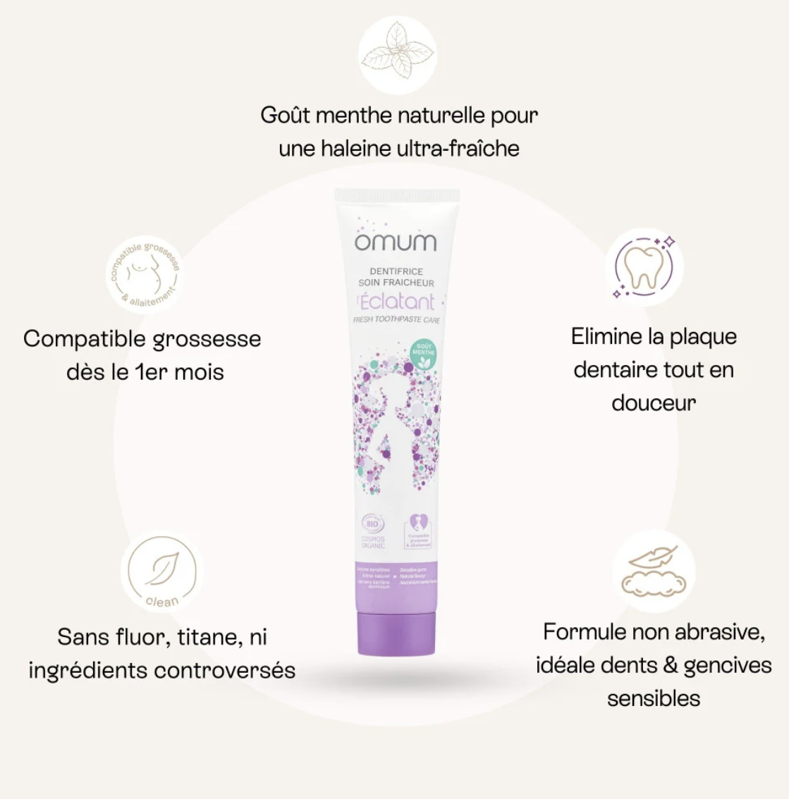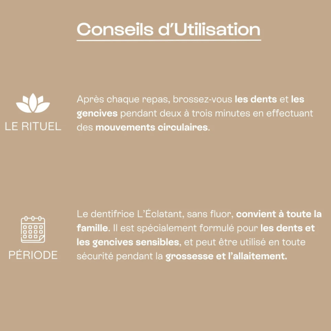 L’Eclatant est un dentifrice sans fluor idéal pour les gencives sensibles, et adapté aux femmes enceintes et aux enfants dès 3 ans. Son goût naturel et ultra-frais de menthe procure une haleine fraiche et une sensation de propreté immédiates !