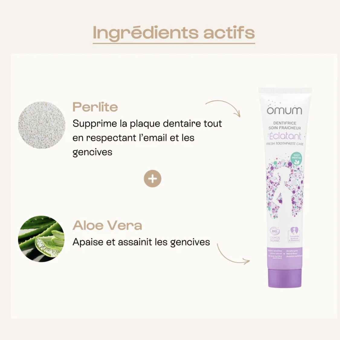 L’Eclatant est LE dentifrice bio et frais pour une hygiène buccale parfaite. L’aloe Vera protège et assainit les gencives. La perlite, grâce à son action micro exfoliante, supprime la plaque dentaire tout en respectant l’email et les gencives. Son parfum naturel de menthe, compatible grossesse et allaitement, assure un brossage très agréable et une haleine fraiche !