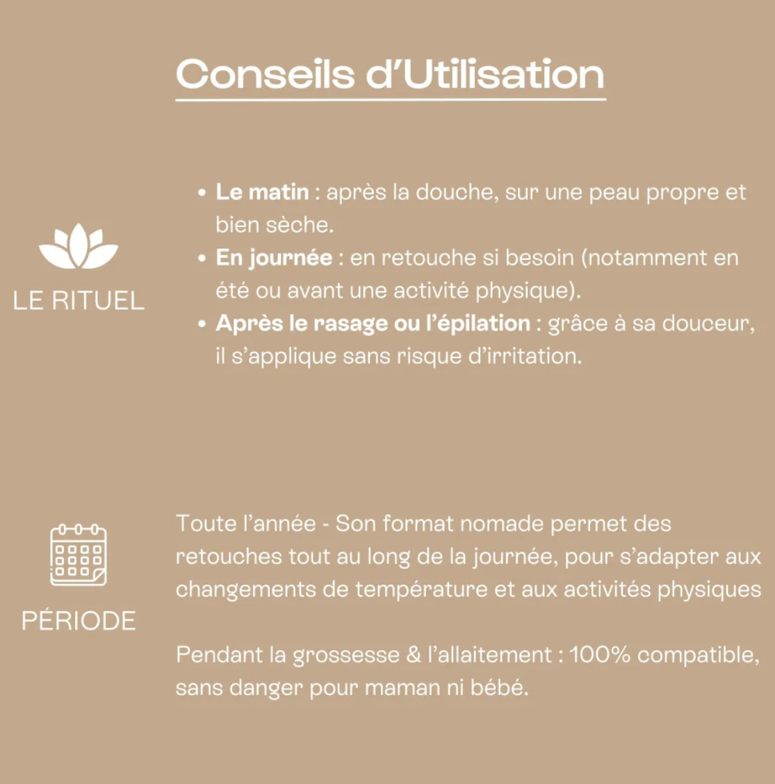 Appliquez votre déodorant sur vos aisselles propres et sèches, même après rasage ou épilation.