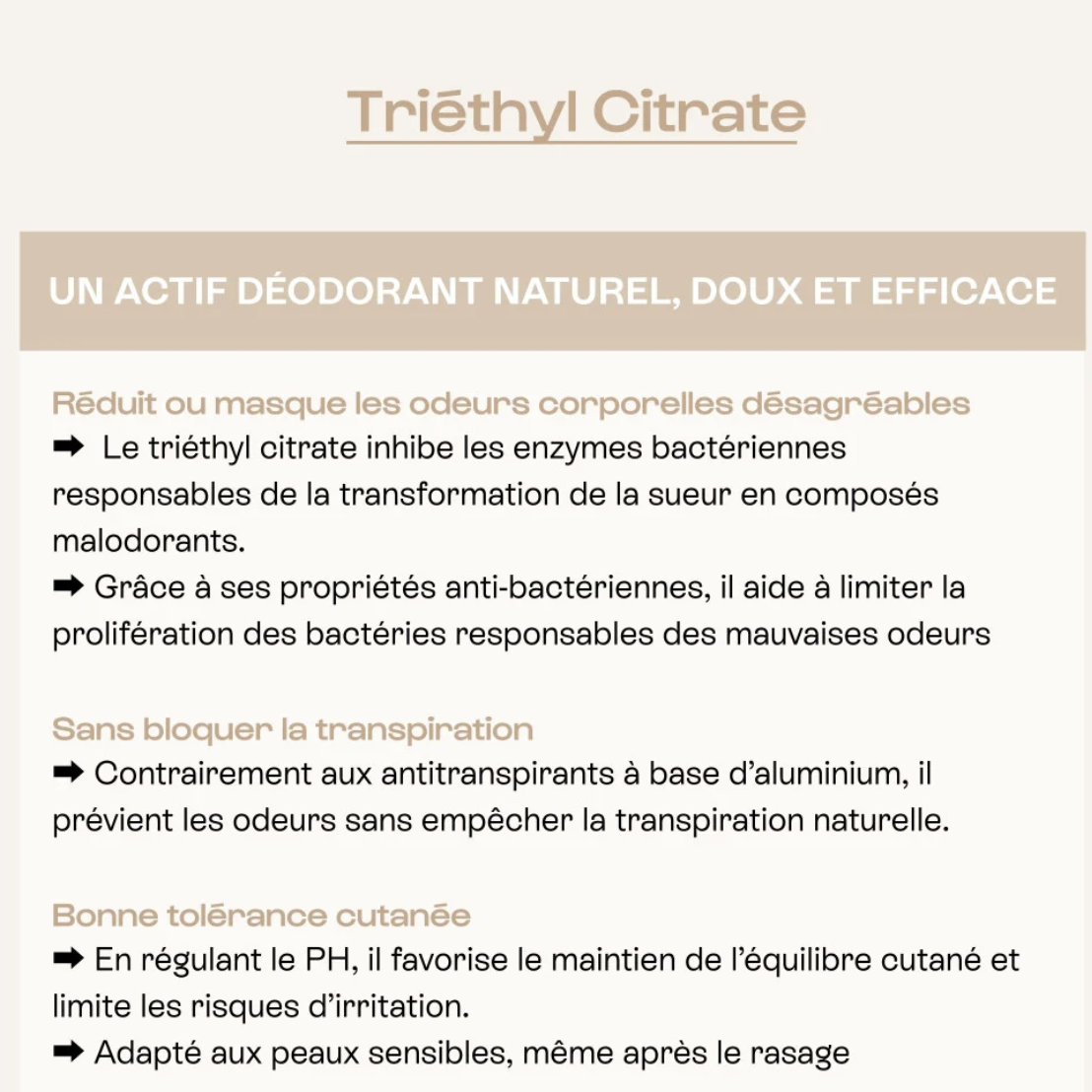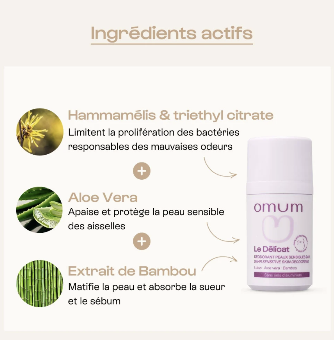 Pourquoi ce déodorant fonctionne si bien ? le triethyl citrate et l’hydrolat d’hamamélis limitent la prolifération des bactéries responsables des mauvaises odeurs. Le bambou matifie la peau et absorbe la sueur et le sébum. Grâce aux vertus des extraits de lotus et de l’aloe vera, la peau sensible des aisselles est apaisée et protégée, les sensations d’inconfort sont soulagées et la peau est infiniment plus douce.