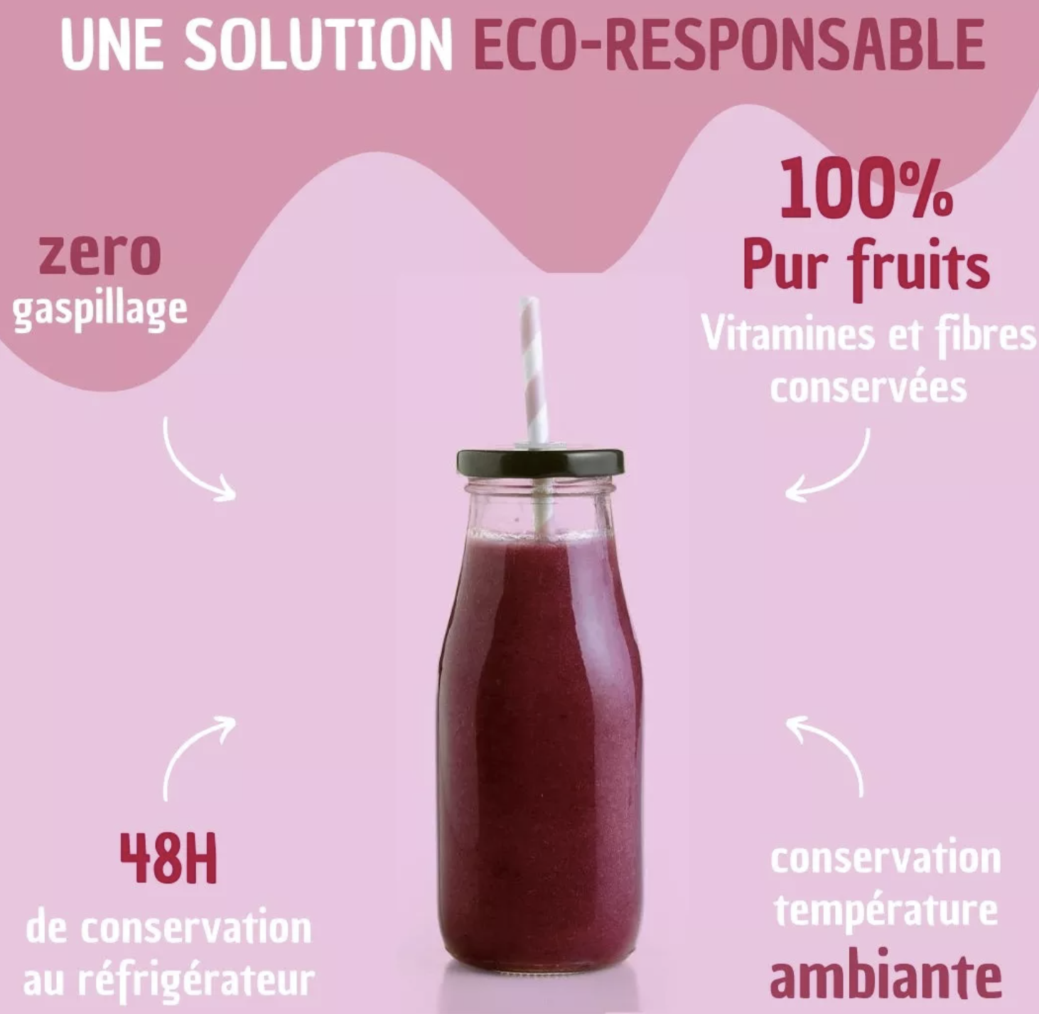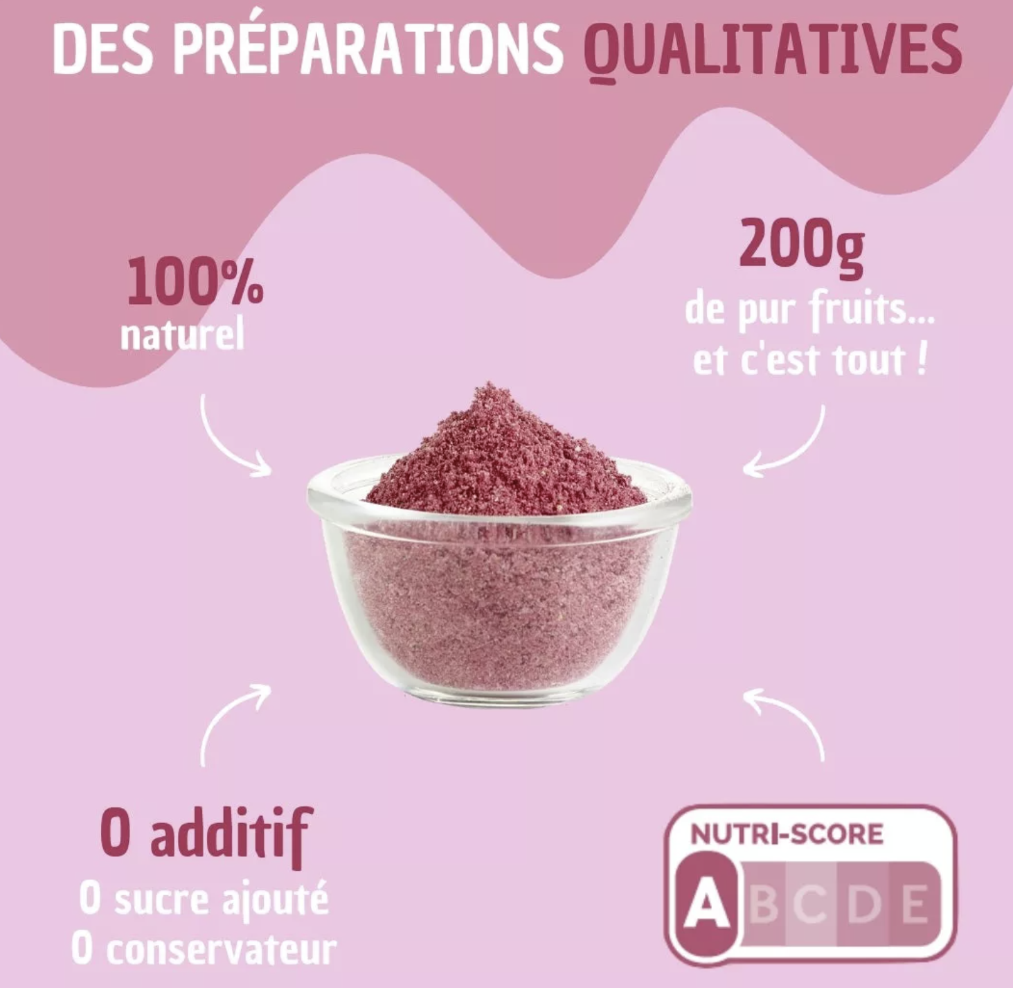 Découvrez une préparation 100% purs fruits à réhydrater avec de l'eau, du jus de pomme ou du lait pour réaliser un smoothie, un smoothie bowl, un cocktail, un milkshake ou un dessert facilement et rapidement.