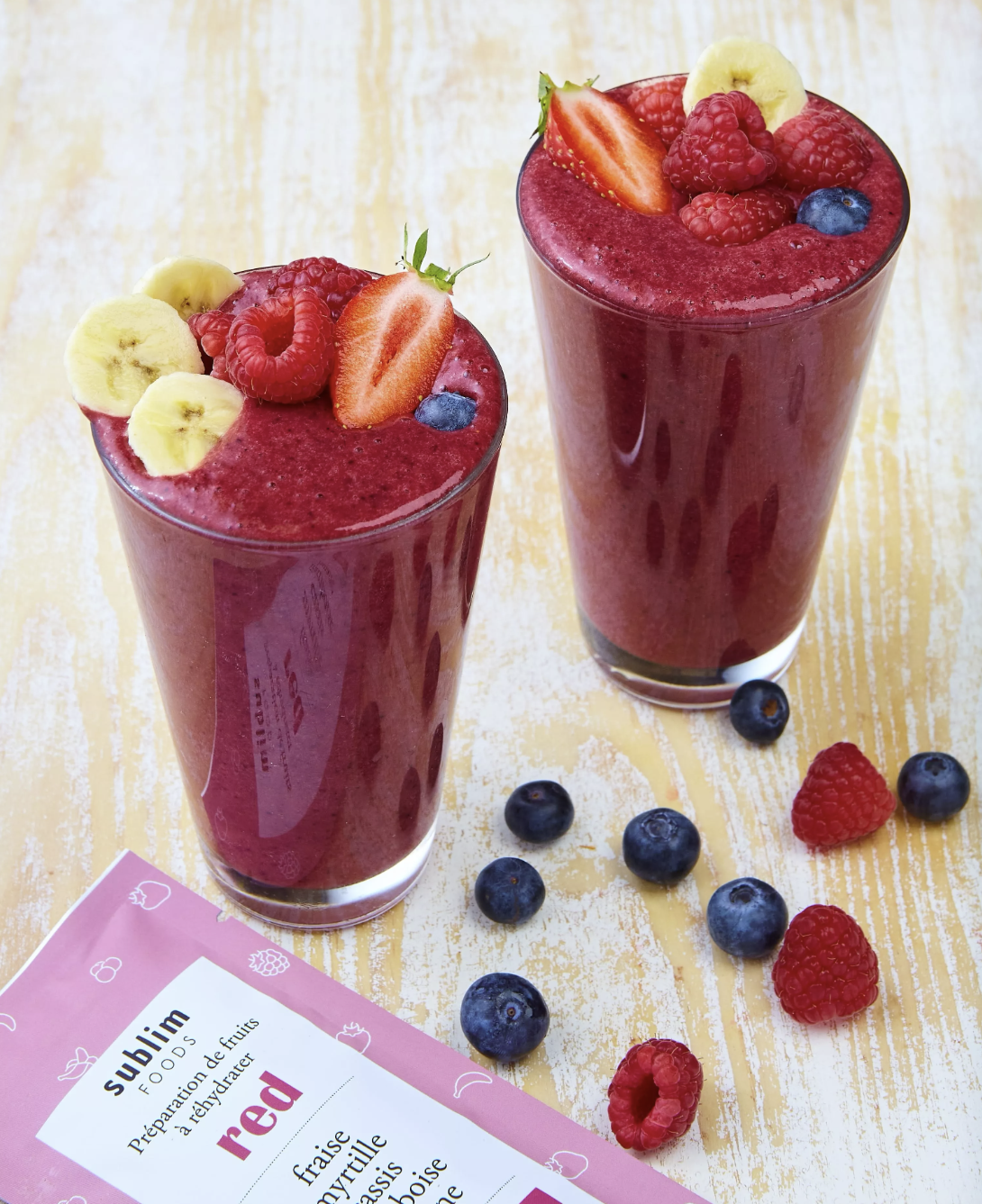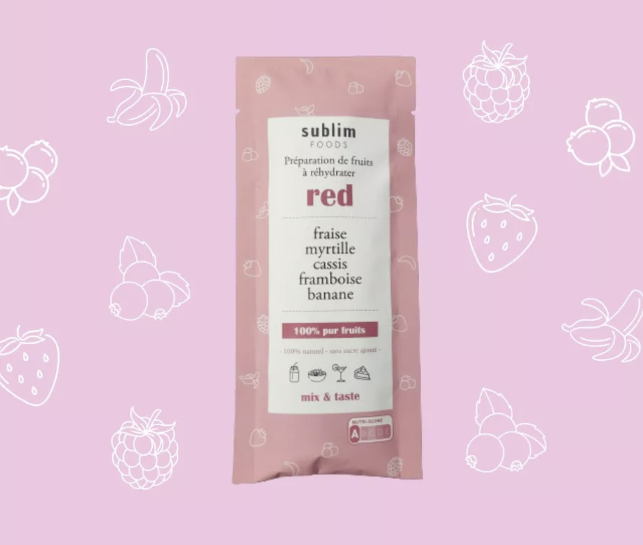 Chaque sachet reprĂ©sente 200 grammes de fruits frais que Sublim Foods a dĂ©shydratĂ© en sâassurant de conserver leurs apports nutritionnels, soit la moitiĂ© des quantitĂ©s journaliĂšres recommandĂ©es.